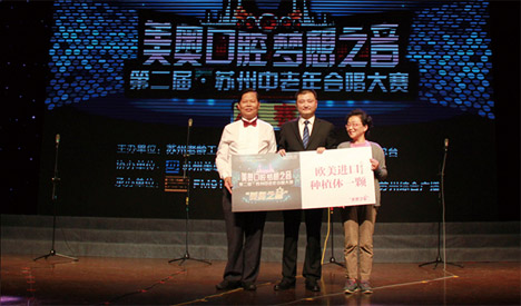 决赛现场还抽取了“美奥之星”,由新世纪合唱团队伍诸菲,木渎镇老年合唱队员王龙根获得,他们将获得由大赛承办方苏州美奥口腔提供的欧美进口种植体奖励。